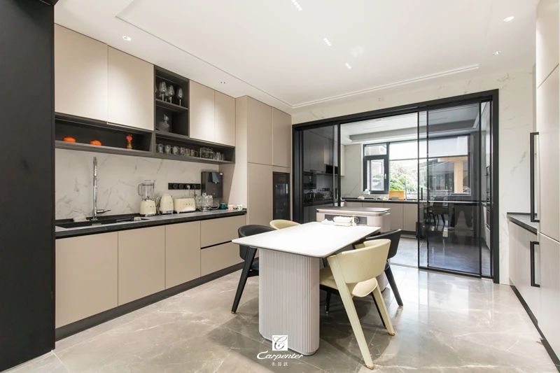 水吧休閑區(qū)與廚房相連,以多樣的展陳方式提升格調,在定制柜與石材餐臺碰撞、線條和飾面交錯間,打造出時尚、豐富的烹飪享食間,唇齒留香,視覺盛宴。