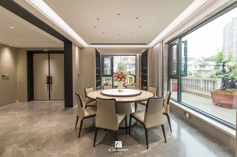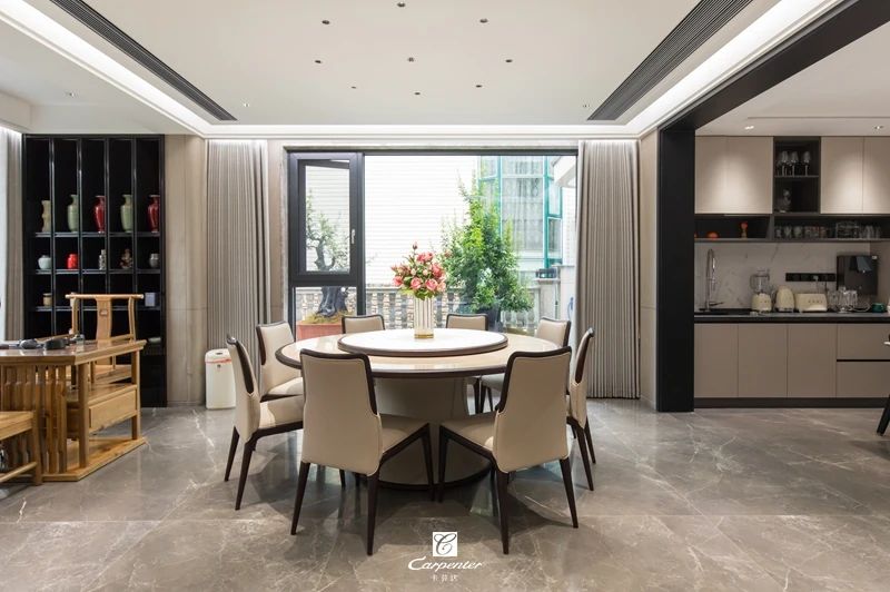 新中式家具讓餐廳空間增色不少,圓餐桌的自然流暢,真皮餐椅的靈動精致,賦予豐富的感官體驗。餐廳一側看到窗外的極致美景,綠意盎然,生機勃勃,為整體空間描繪了一幅清新的綠野畫卷。