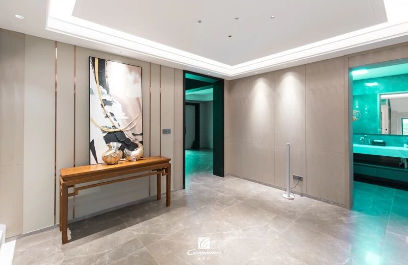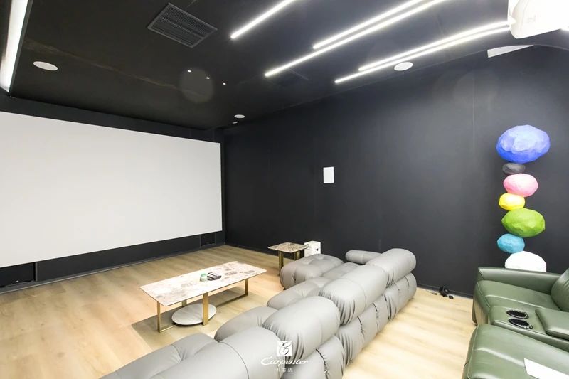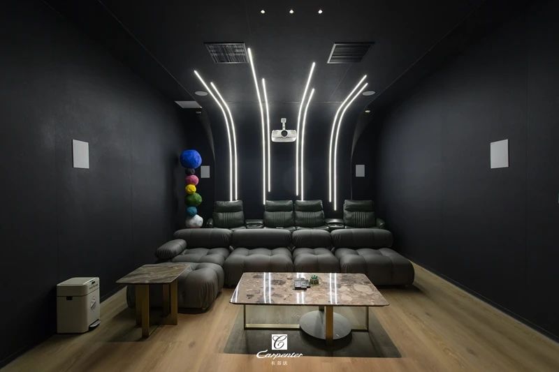 影音室以簡潔、純粹淡化空間氛圍,材質、燈光與藝術融合,闊奢氣氛彌漫其中,給人一種自由、放松、嫻靜的舒適感。