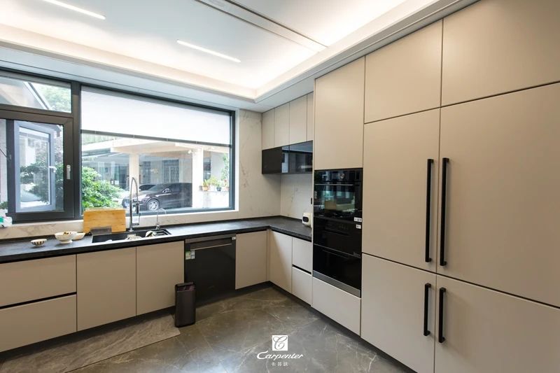 水吧休閑區(qū)與廚房相連,以多樣的展陳方式提升格調,在定制柜與石材餐臺碰撞、線條和飾面交錯間,打造出時尚、豐富的烹飪享食間,唇齒留香,視覺盛宴。